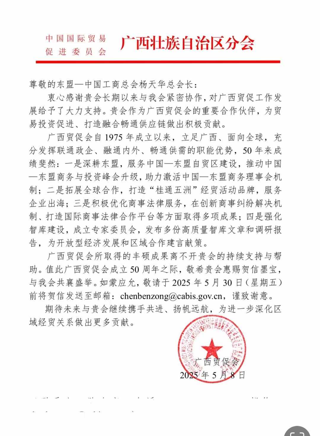 广西贸促会所取得的丰硕成果离不开贵会的持续支持与帮助。值此广西贸促会成立50周年之际,敬希贵会惠赐贺信墨宝,与我会共襄盛举。如蒙应允,敬请于2025年5月30日(星期五)前将贺信发送至邮箱:chenbenzong@cabis.gov.cn,谨致谢意。